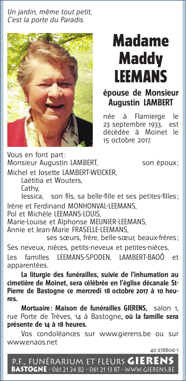 Décédée à Bastogne (6600) le dimanche 15 octobre 2017 à l'âge de 84 ans