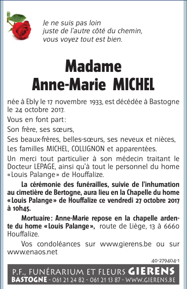 Décédée à Bastogne (6600) le mardi 24 octobre 2017 à l'âge de 83 ans