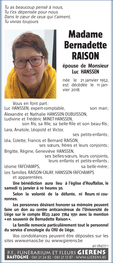 Décédée à Liège (4000) le jeudi 11 janvier 2018 à l'âge de 65 ans