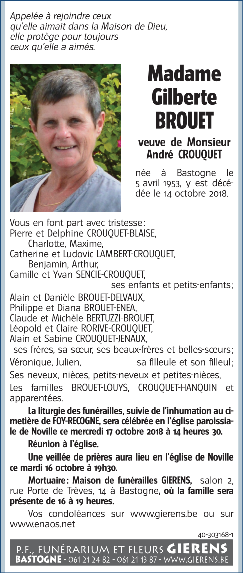 Décédée à Bastogne (6600) le dimanche 14 octobre 2018 à l'âge de 65 ans