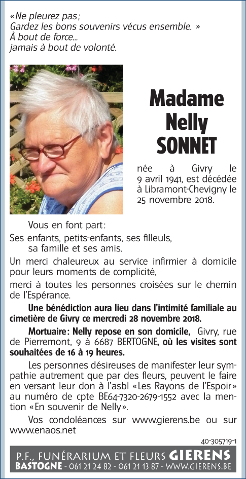 Décédée à Libramont-Chevigny (6800) le dimanche 25 novembre 2018 à l'âge de 77 ans