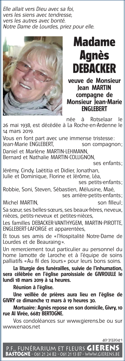 Décédée à La Roche-en-Ardenne (6980) le jeudi 14 mars 2019 à l'âge de 80 ans