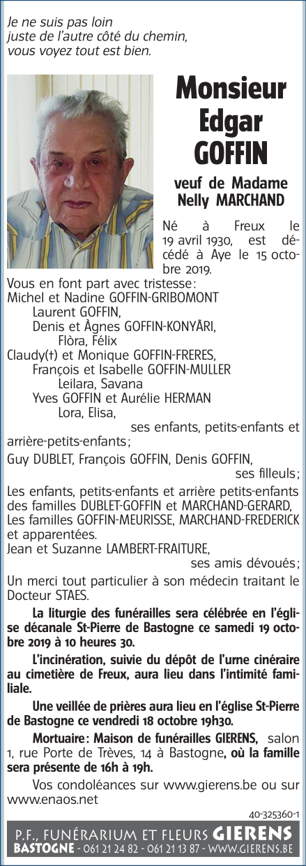 Décédé à Marche-en-Famenne (6900) le mardi 15 octobre 2019 à l'âge de 89 ans