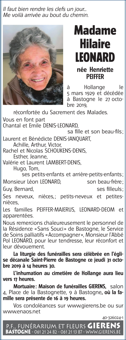 Décédée à Bastogne (6600) le dimanche 27 octobre 2019 à l'âge de 90 ans
