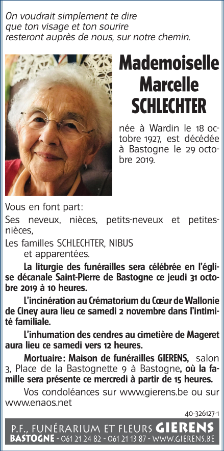Décédée à Bastogne (6600) le mardi 29 octobre 2019 à l'âge de 92 ans