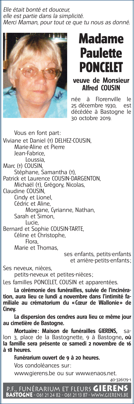 Décédée à Bastogne (6600) le mercredi 30 octobre 2019 à l'âge de 88 ans