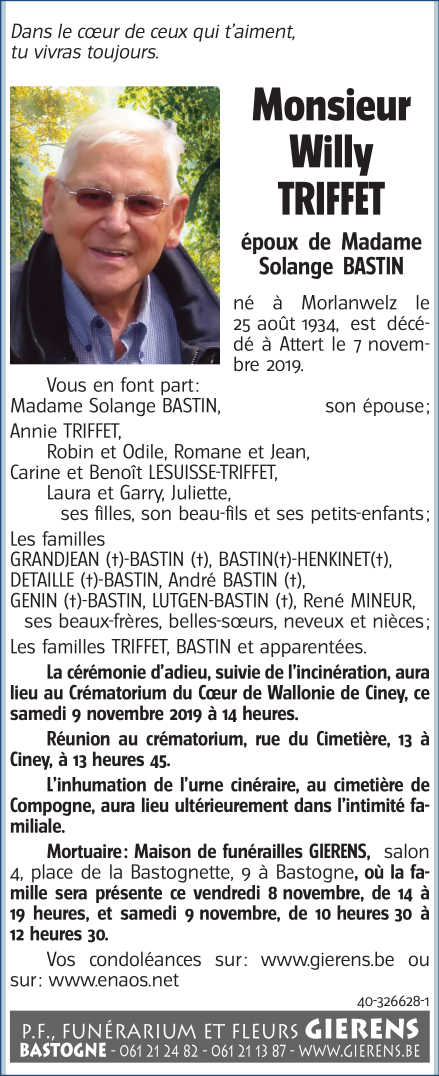 Décédé à Attert (6717) le jeudi 7 novembre 2019 à l'âge de 85 ans