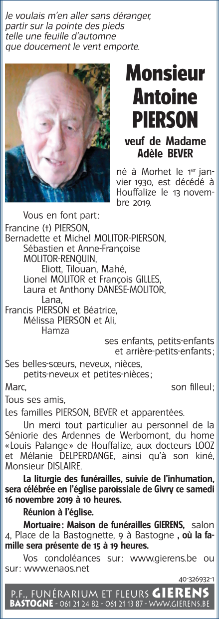 Décédé à Houffalize (6660) le mercredi 13 novembre 2019 à l'âge de 89 ans