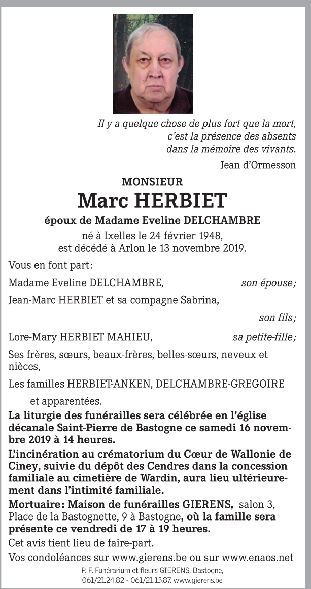 Décédé à Arlon (6700) le mercredi 13 novembre 2019 à l'âge de 71 ans