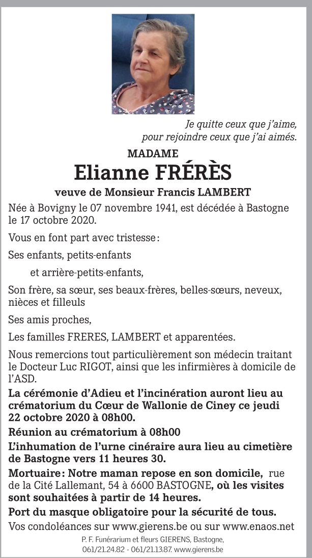 Décédée à Bastogne (6600) le samedi 17 octobre 2020 à l'âge de 78 ans