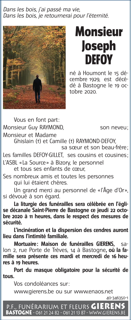 Décédé à Bastogne (6600) le lundi 19 octobre 2020 à l'âge de 90 ans