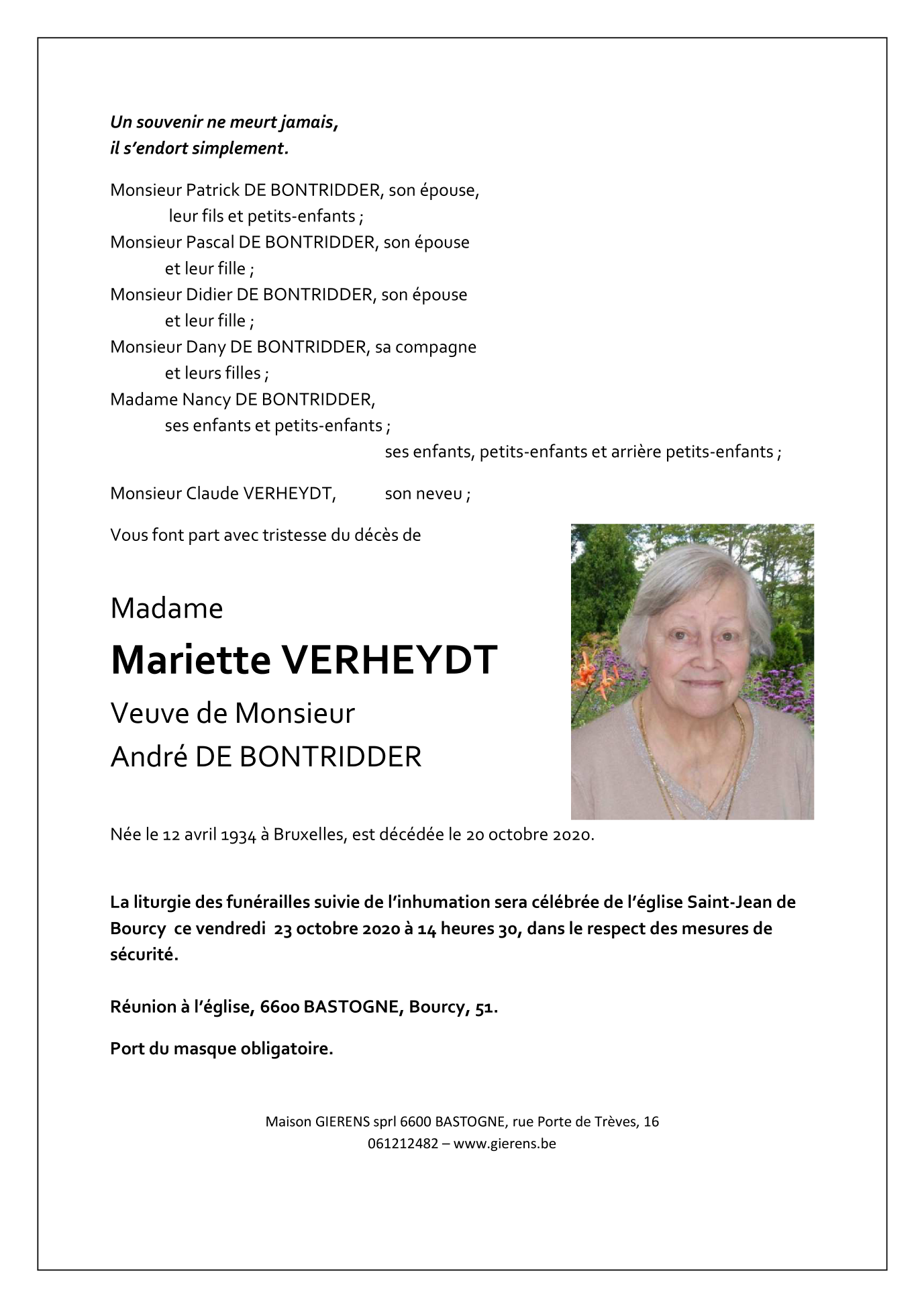Décédée à Bastogne (6600) le mardi 20 octobre 2020 à l'âge de 86 ans