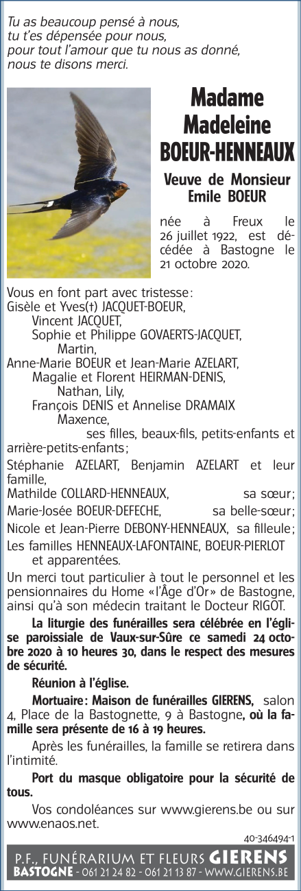 Décédée à Bastogne (6600) le mercredi 21 octobre 2020 à l'âge de 98 ans