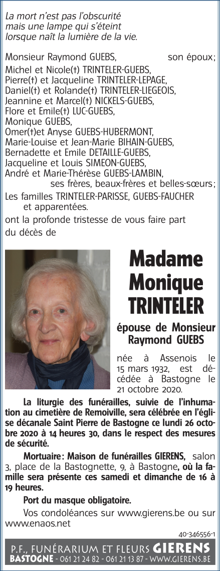Décédée à Bastogne (6600) le mercredi 21 octobre 2020 à l'âge de 88 ans