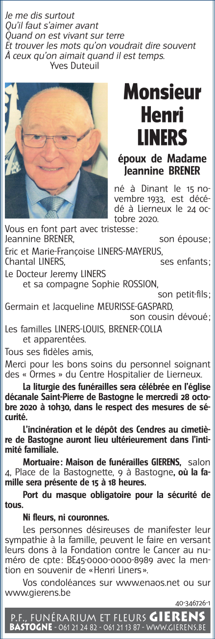 Décédé à Lierneux (4990) le samedi 24 octobre 2020 à l'âge de 86 ans