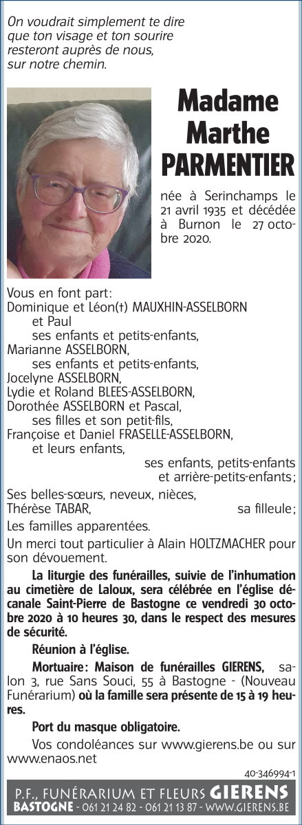 Décédée à Fauvillers (6637) le mardi 27 octobre 2020 à l'âge de 85 ans