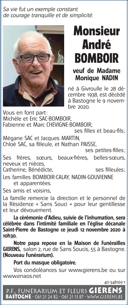 Décédé à Bastogne (6600) le lundi 9 novembre 2020 à l'âge de 81 ans