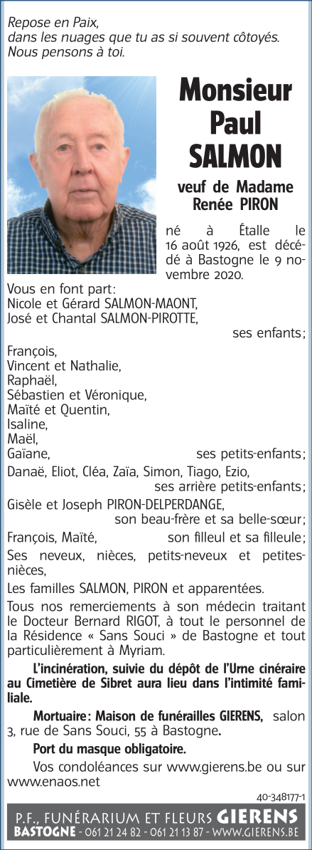 Décédé à Bastogne (6600) le lundi 9 novembre 2020 à l'âge de 94 ans