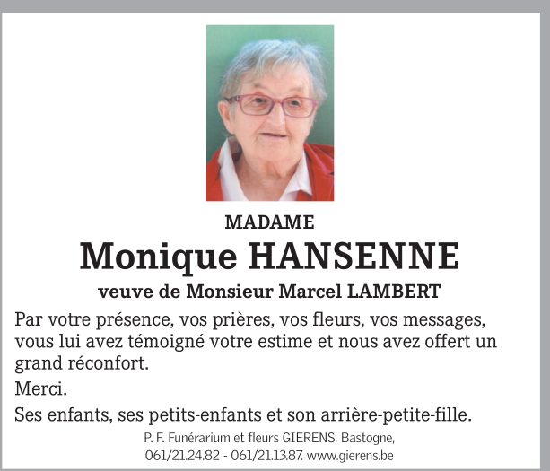 Décédée à Lierneux (4990) le mercredi 21 octobre 2020 à l'âge de 81 ans