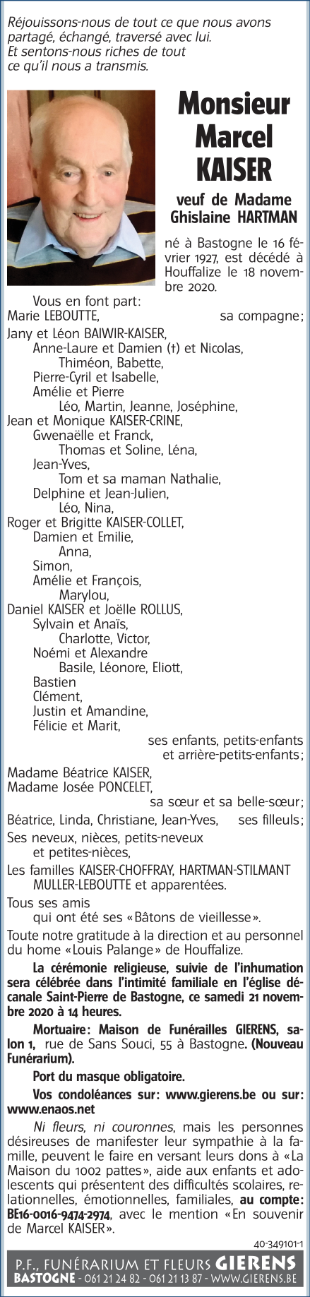 Décédé à Houffalize (6660) le mercredi 18 novembre 2020 à l'âge de 93 ans