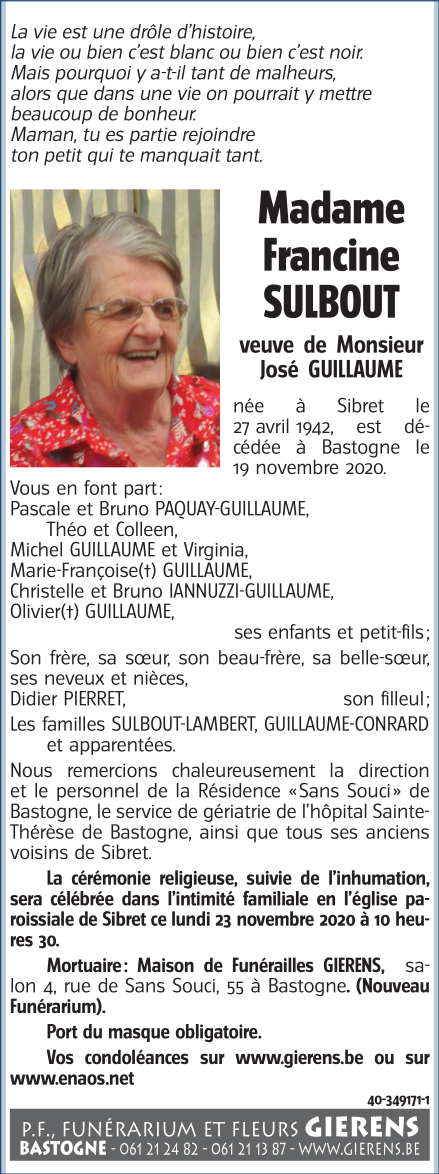 Décédée à Bastogne (6600) le jeudi 19 novembre 2020 à l'âge de 78 ans