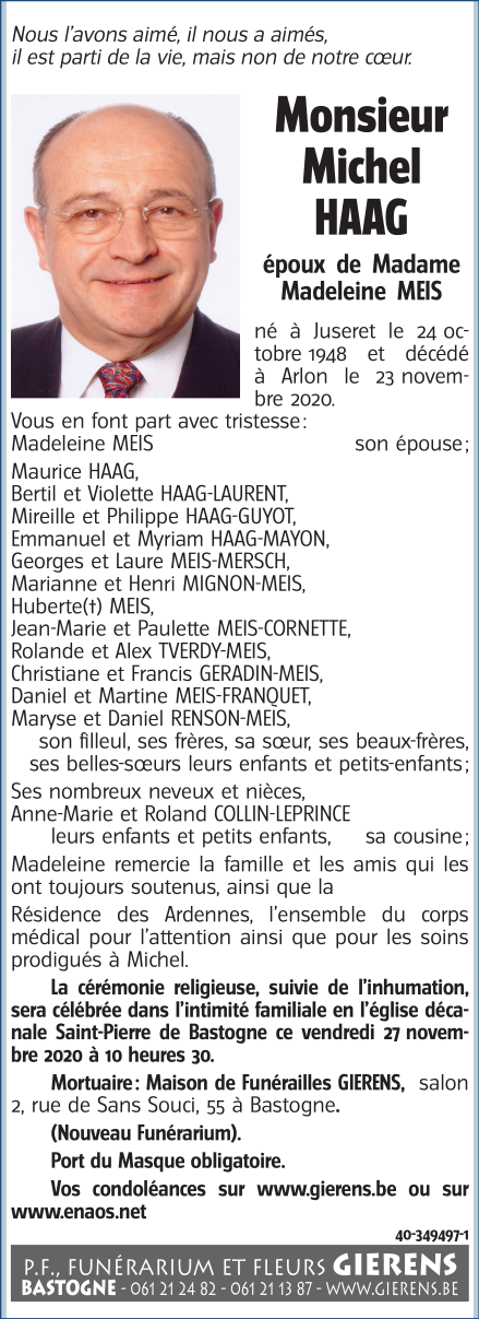 Décédé à Arlon (6700) le lundi 23 novembre 2020 à l'âge de 72 ans
