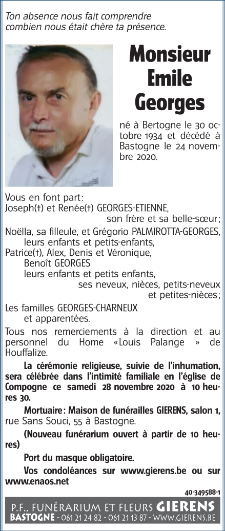 Décédé à Bastogne (6600) le mardi 24 novembre 2020 à l'âge de 86 ans