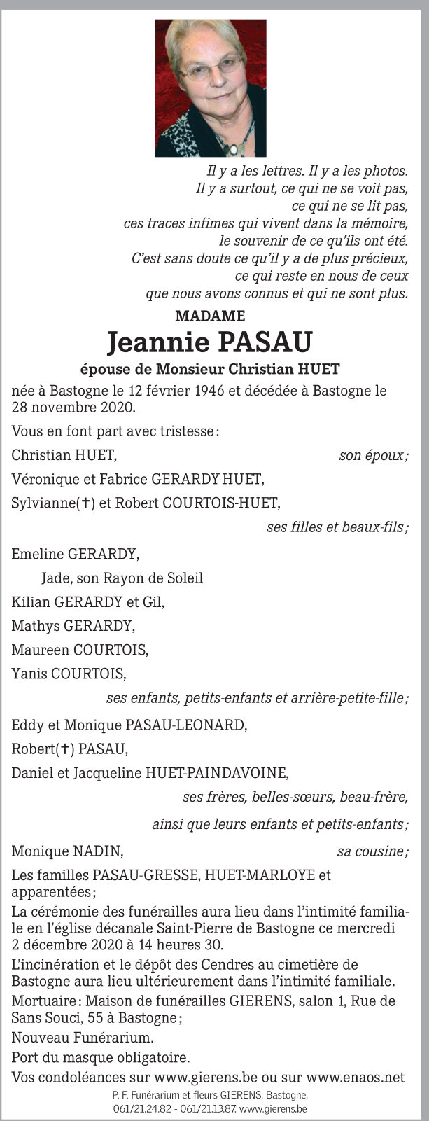 Décédée à Bastogne (6600) le samedi 28 novembre 2020 à l'âge de 74 ans