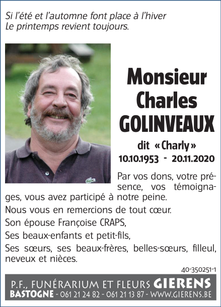 Décédé à Bastogne (6600) le vendredi 20 novembre 2020 à l'âge de 67 ans