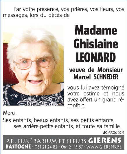 Décédée à Bastogne (6600) le samedi 21 novembre 2020 à l'âge de 91 ans