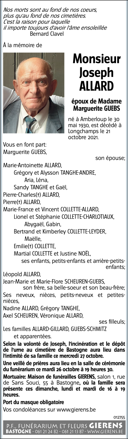Décédé à Bertogne (6687) le jeudi 21 octobre 2021 à l'âge de 91 ans