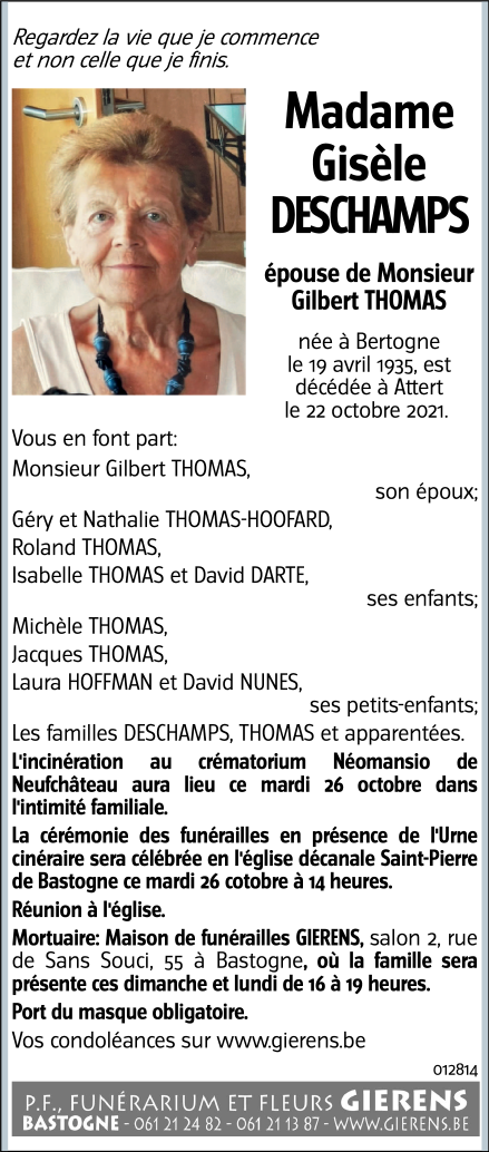 Décédée à Attert (6717) le vendredi 22 octobre 2021 à l'âge de 86 ans