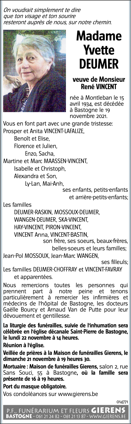 Décédée à Bastogne (6600) le vendredi 19 novembre 2021 à l'âge de 87 ans