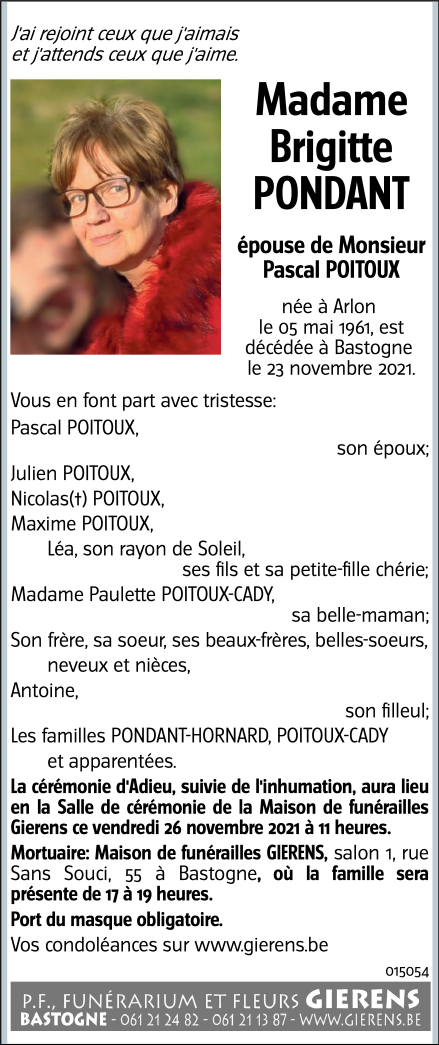 Décédée à Bastogne (6600) le mardi 23 novembre 2021 à l'âge de 60 ans