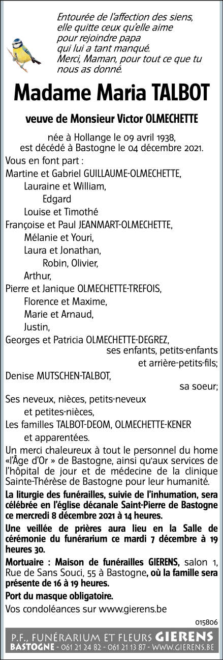 Décédée à Bastogne (6600) le samedi 4 décembre 2021 à l'âge de 83 ans