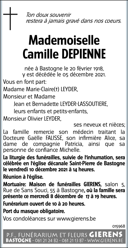 Décédée à Bastogne (6600) le dimanche 5 décembre 2021 à l'âge de 103 ans