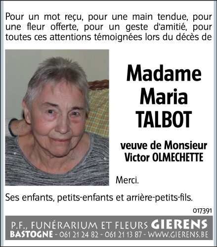 Décédée à Bastogne (6600) le samedi 4 décembre 2021 à l'âge de 83 ans