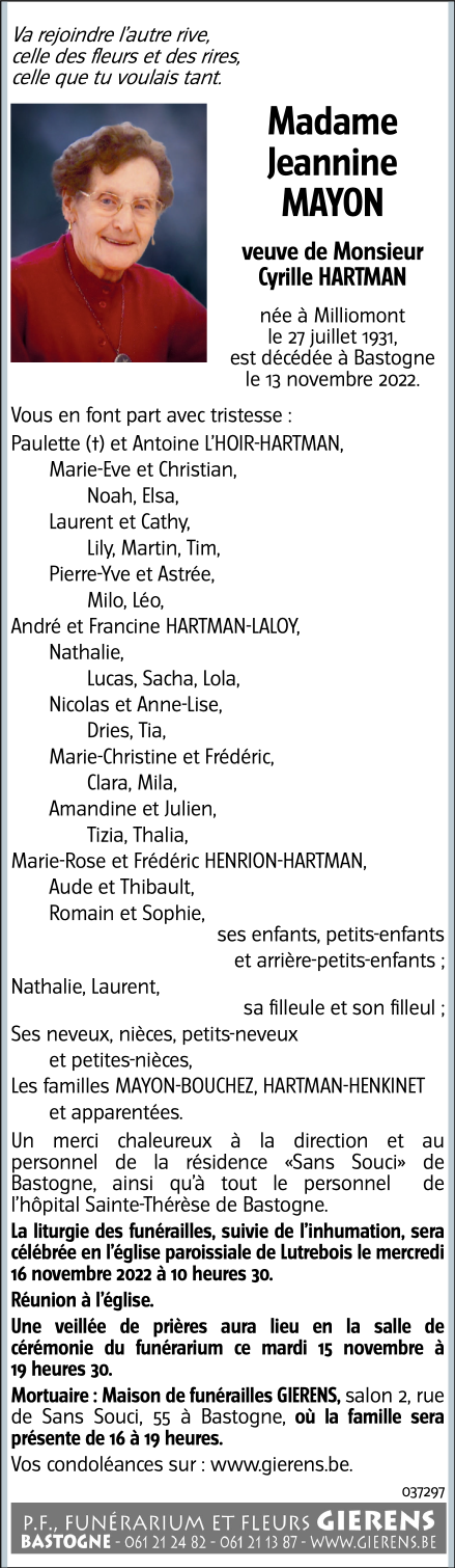 Décédée à Bastogne (6600) le dimanche 13 novembre 2022 à l'âge de 91 ans