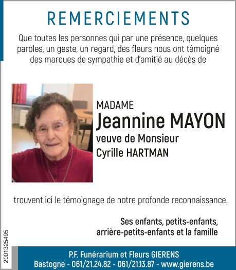 Décédée à Bastogne (6600) le dimanche 13 novembre 2022 à l'âge de 91 ans