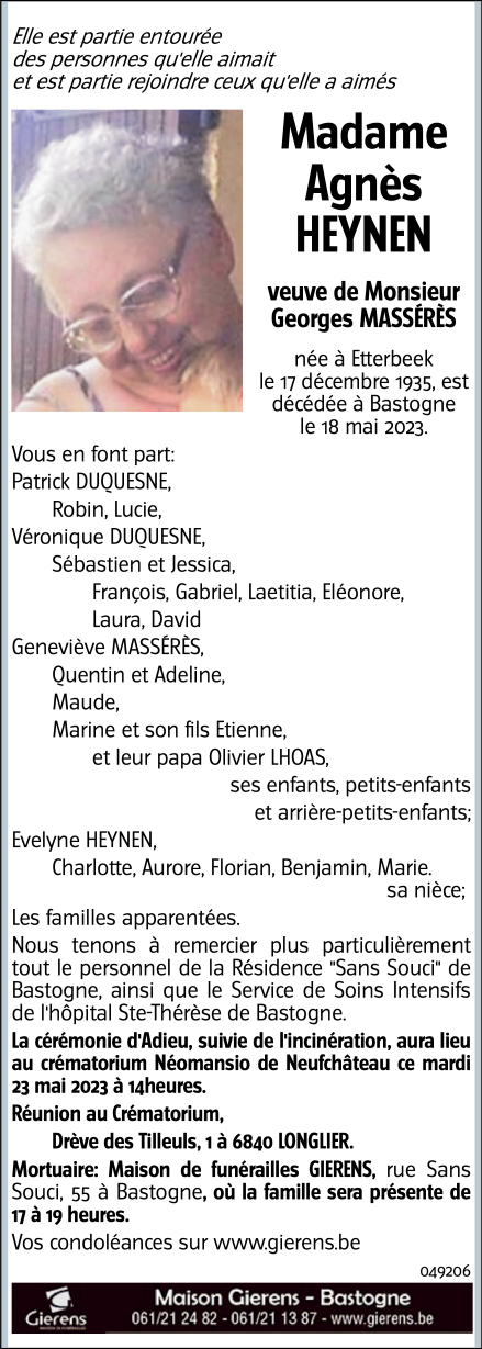Décédée à Bastogne (6600) le jeudi 18 mai 2023 à l'âge de 87 ans