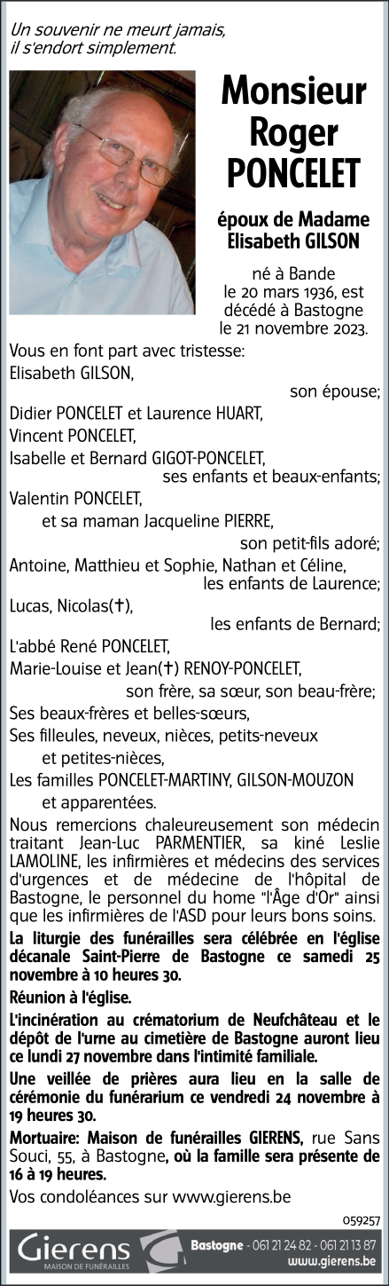 Décédé à Bastogne (6600) le mardi 21 novembre 2023 à l'âge de 87 ans
