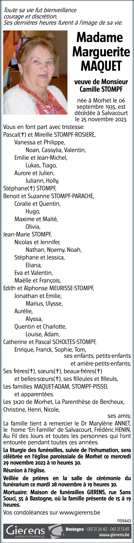 Décédée à Vaux-sur-Sure (6640) le samedi 25 novembre 2023 à l'âge de 88 ans