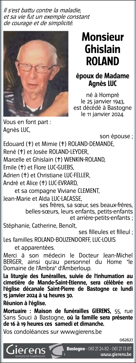 Décédé à Bastogne (6600) le jeudi 11 janvier 2024 à l'âge de 80 ans