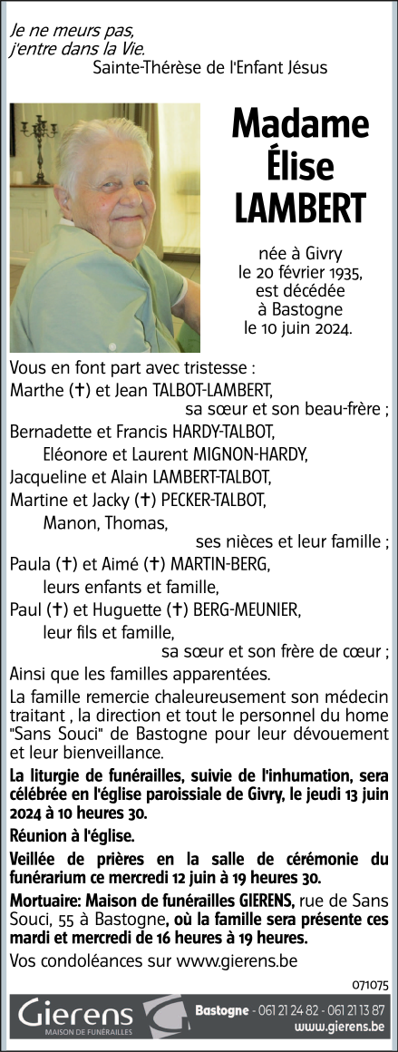 Décédée à Bastogne (6600) le lundi 10 juin 2024 à l'âge de 89 ans