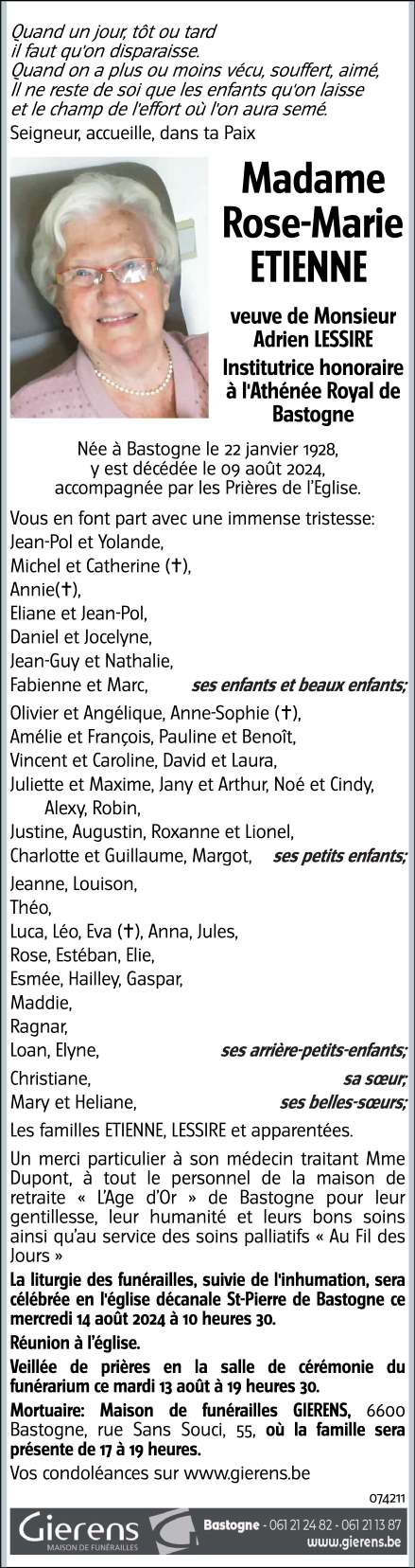 Décédée à Bastogne (6600) le vendredi 9 août 2024 à l'âge de 96 ans