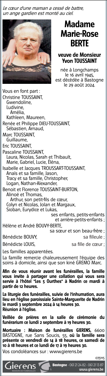 Décédée à Bastogne (6600) le jeudi 29 août 2024 à l'âge de 79 ans