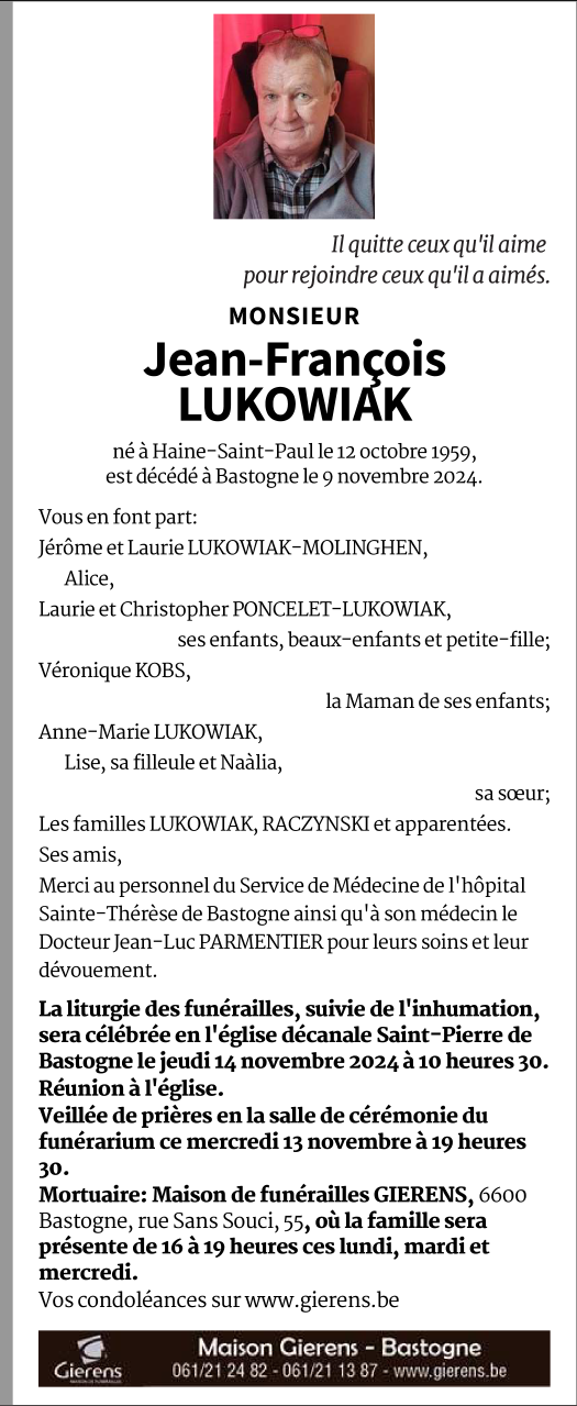 Décédé à Bastogne (6600) le samedi 9 novembre 2024 à l'âge de 65 ans