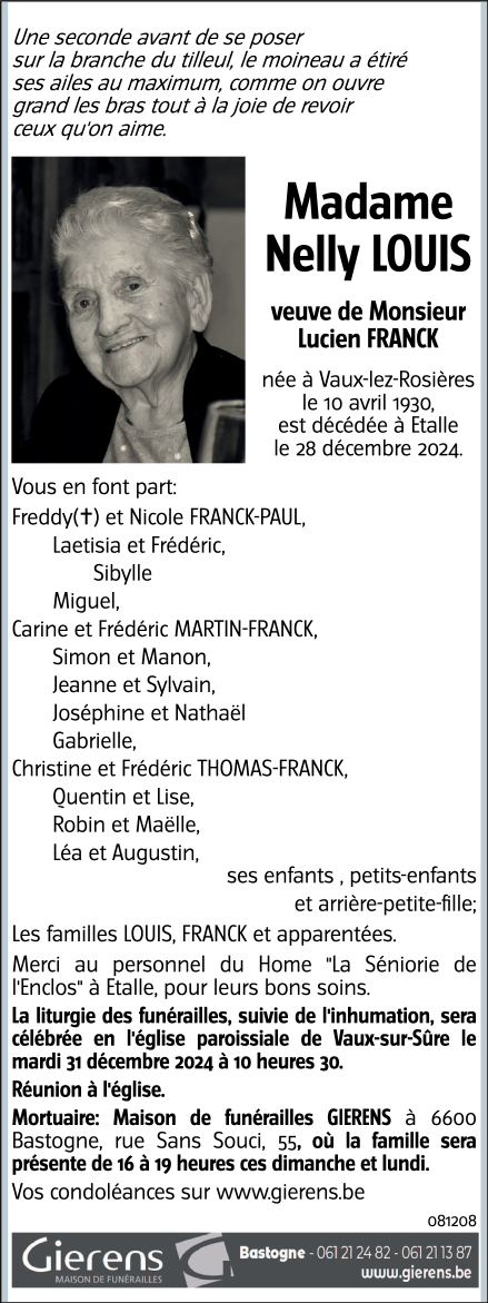 Décédée à Etalle (6740) le samedi 28 décembre 2024 à l'âge de 94 ans