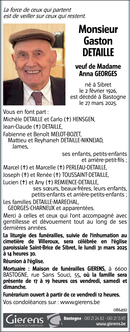 Décédé à Bastogne (6600) le jeudi 27 mars 2025 à l'âge de 99 ans