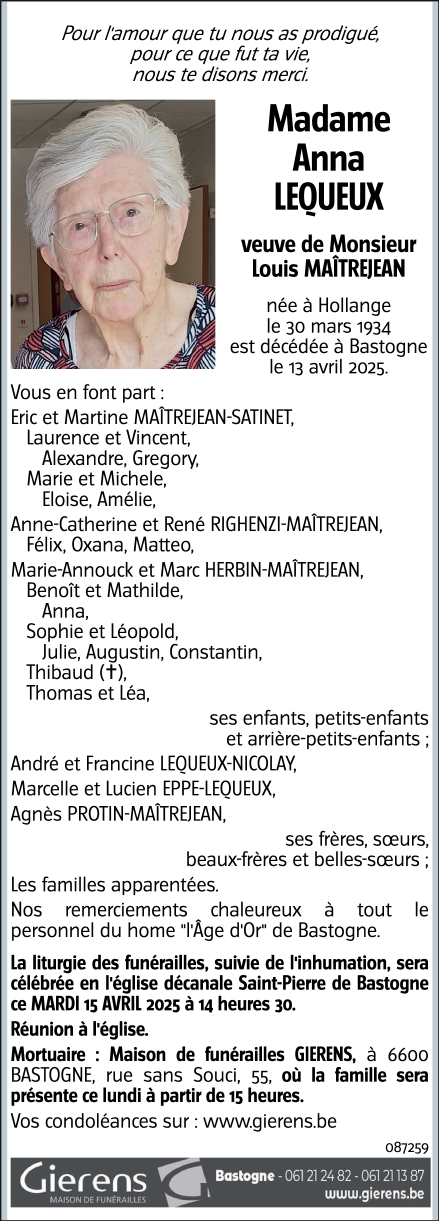 Décédée à Bastogne (6600) le dimanche 13 avril 2025 à l'âge de 91 ans